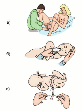При внезапных родах необходимо: а) принять ребенка в чистую ткань; б) если ребенок не закричит, удалить околоплодные воды у него изо рта, в) как только пуповина прекратит пульсировать, перевязать ее тесемкой в двух местах.