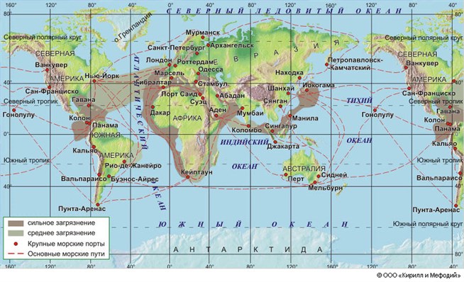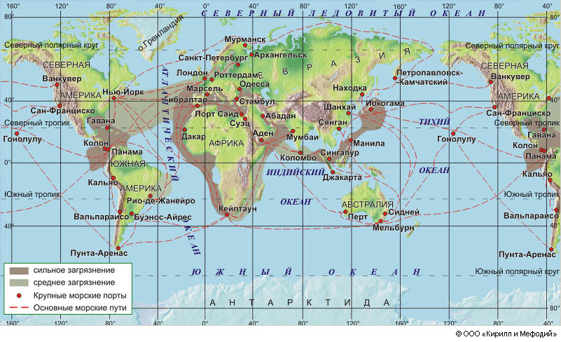 Нефтяное загрязнение в Мировом океане. Сильное загрязнение наблюдается у побережий, где располагаются морские порты, нефтеперерабатывающие заводы и загрязненные сбросами стоки рек. Географическая карта.