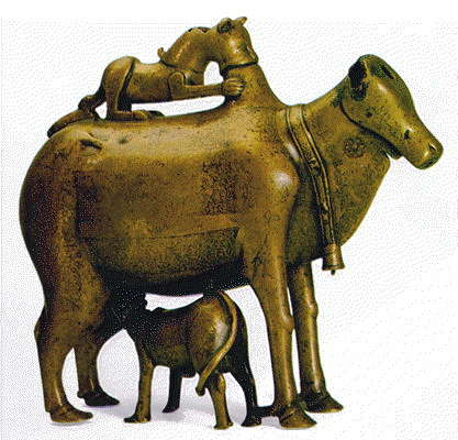 Водолей. Сосуд в виде коровы с теленком и напавшим на нее львом. Мастер Рузбек ибн Афридун. Персия. Бронза. Литье. Инкрустация серебром. Высота 31 см. Эрмитаж, Петербург.