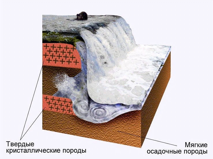 Водопады образуются на местах выхода в районе русла реки более твердых кристаллических пород. Преодолевая их, вода размывает мягкие осадочные породы. Вследствие этого на границе твердых и мягких пород образуется вертикальный уступ, с которого падает вода.