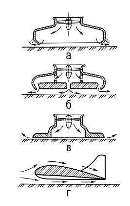 Воздушная подушка. Основные схемы образования: а — камерная; б — сопловая; в — щелевая; г — крыльевая.
