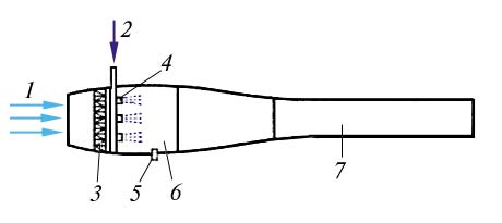 Схема пульсирующего воздушно-реактивного двигателя: 1 – воздух; 2 – горючие; 3 – клапанная решетка; 4 – форсунки; 5 – свеча; 6 – камера сгорания; 7 – сопло.