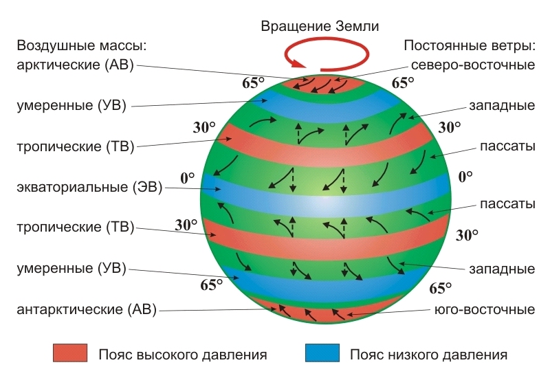 Перемещение воздушных масс, определяющее направление ветра в разных климатических поясах и влияющее на погоду.