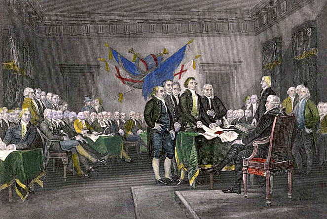 Война за независимость в Северной Америке 1775-83. Подписание декларации независимости США, принятой на 2-м Континентальным конгрессом 4 июля 1776. Декларация провозглашала отделение колоний от метрополии и образование самостоятельного государства — Соединенных Штатов Америки.