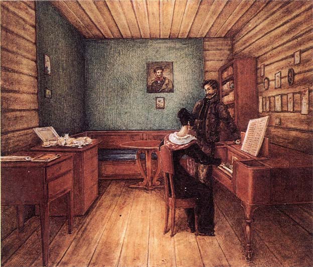 Н. Бестужев. «С. Г. Волконский с женой в камере, отведенной им в Петровской тюрьме».