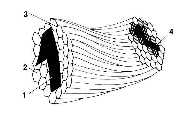 Поэлементная передача изображения волоконной деталью: 1 — изображение на входе; 2 — светопроводящая жила; 3 — изолирующая прослойка; 4 — мозаичное изображение на выходе.