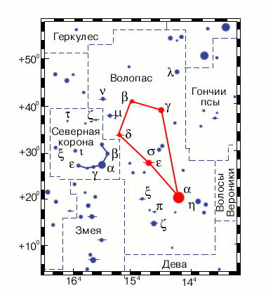 Созвездие Волопаса. Наиболее благоприятные условия видимости в апреле – мае. Видно на всей территории России.