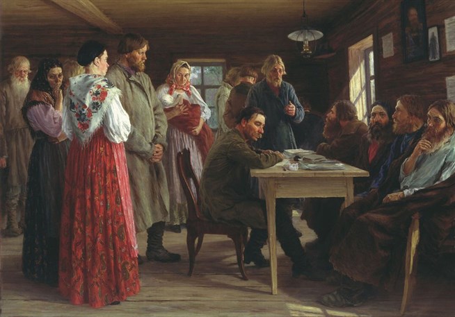 Михаил Иванович Зощенко (1857-1907). Волостной суд. 1888 год. Холст, масло. Третьяковская галерея, Москва. М.И. Зощенко — отец М.М. Зощенко.