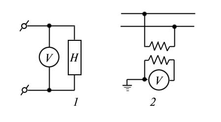 Схема включения вольтметра: 1 – с нагрузкой; 2 – через измерительный трансформатор.