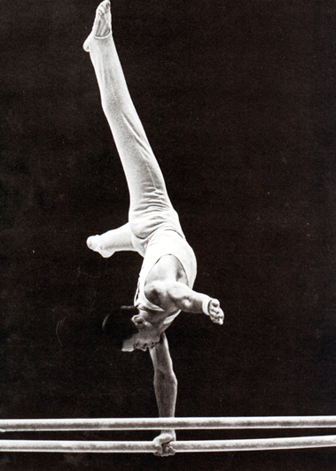 Михаил Воронин выполняет стойку на одной руке в упражнениях на брусьях.