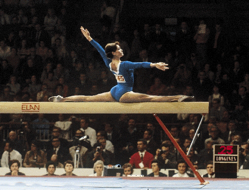 Зинаида Воронина выполняет упражнение на самом коварном снаряде женского гимнастического многоборья — бревне (Мехико, 1968).