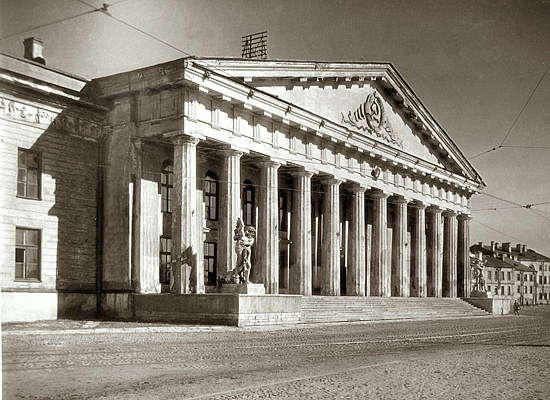 А. Н. Воронихин. Горный институт (1806-11, Санкт-Петербург). Монументальный портик с фронтоном, который поддерживает 12 каннелированных дорических колонн, акцентирует фасад здания. На постаментах широкой пологой лестницы размещены две скульптурные группы: «Геракл, удушающий Антея» (1809-11) С. С. Пименова и «Похищение Презерпины Плутоном» (1809-11) В. И. Демут-Малиновского.