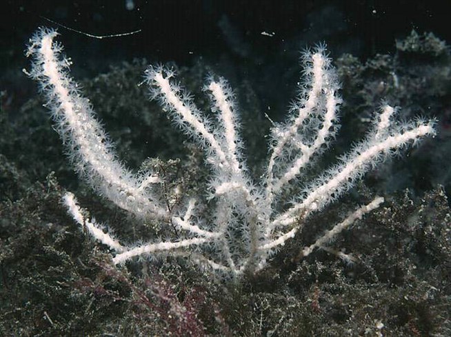 Горгония (Swiftia pallida). Коралловый восьмилучевой полип. Похожа на мягкие кораллы, но в отличие от них прикрепляется к грязи или к песку, а не к твердой поверхности.