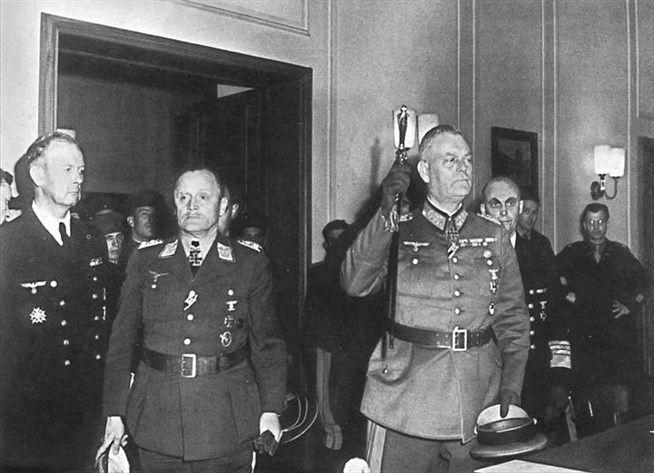 Немецкая делегация на подписании акта о безоговорочной капитуляции Германии в пригороде Берлина Карлсхорсте. 8 мая 1945.
