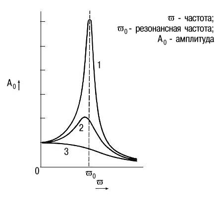 Вынужденные колебания. Зависимость их амплитуды от частоты внешнего воздействия при различном затухании: 1 — слабое затухание; 2 — сильное затухание; 3 — критическое затухание.