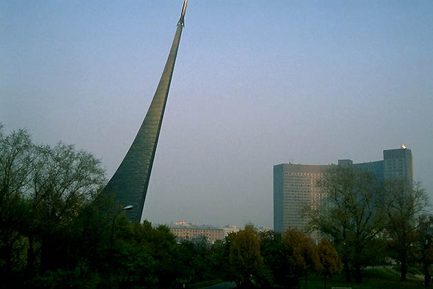 Памятник первым покорителям космоса (расположен близ ВДНХ, ВВЦ). Справа: гостиница «Космос».