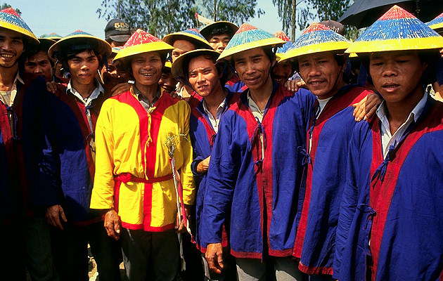 Вьетнамцы в традиционных костюмах и головных уборах.