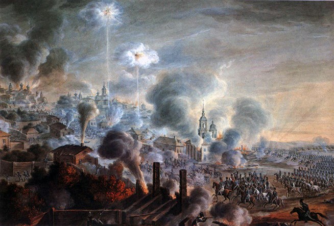 Освобождение Вязьмы. Акварель неизвестного художника. 1820-е гг. 22 октября 1812 генерал Милорадович атаковал отступающих французов у Вязьмы. В результате кровопролитных боев Вязьма была освобождена.