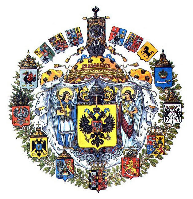 На гербе Российской империи рубежа XIX и XX веков представлены почти все элементы полного герба.