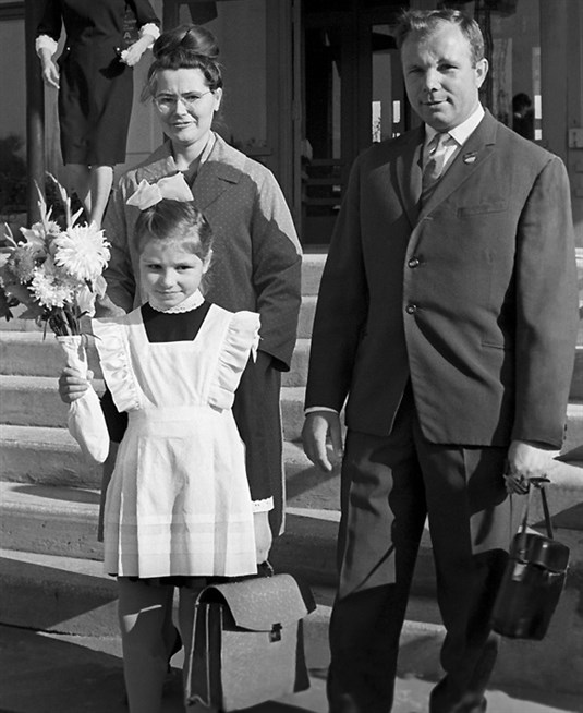 Звездный городок. Юрий Гагарин с женой Валентиной провожают в первый класс дочь Елену. 1 сентября 1966 года. Снимок Валентина Черединцева.