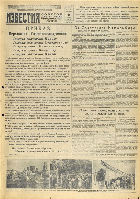 Передовица газеты «Известия» от 6 августа 1943 года с Приказом Верховного Главнокомандующего о проведении в Москве салюта в ознаменование освобождения городов Орел и Белгород