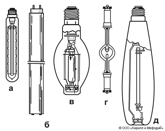 Газоразрядные источники света: а — натриевая лампа низкого давления; б — люминесцентная лампа; в — ртутная лампа высокого давления с исправленной цветностью; г — ксеноновая лампа сверхвысокого давления; д — натриевая лампа высокого давления с колбой из поликристаллической окиси алюминия.