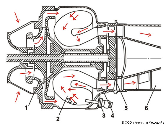 Газотурбинный двигатель: 1 — центробежный компрессор; 2 — камера сгорания; 3 — топливная форсунка; 4 — сопловой аппарат; 5 — рабочее колесо турбины; 6 — выхлопной патрубок.