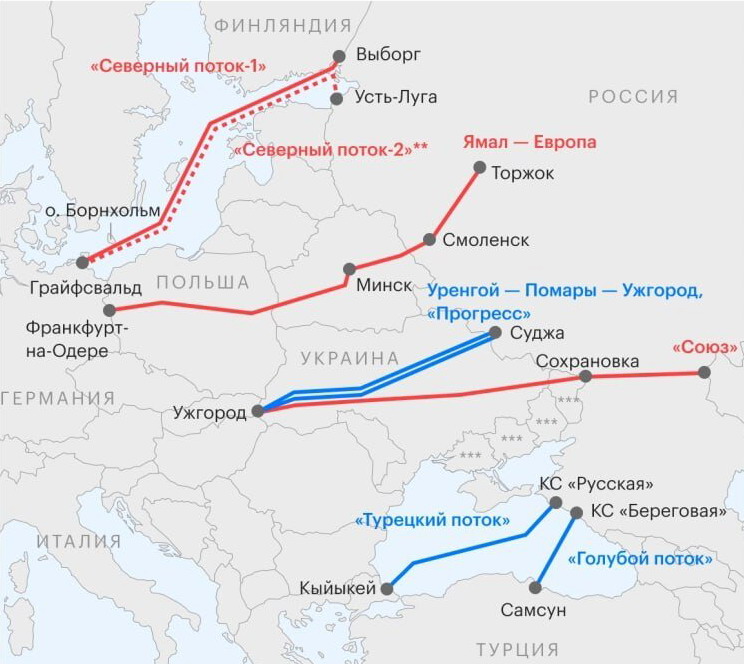 Маршруты поставок «Газпрома» в Европу. Синим цветом отмечены действующие газопроводы, красным - не использующиеся