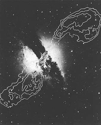Эллиптическая галактика Кентавр А с необычайно широкой полосой пыли (приведены также линии равной интенсивности радиоизлучения).