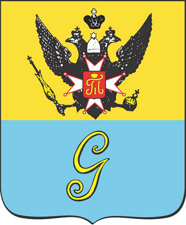 Герб Гатчины был утвержден 13 декабря 1800 года. В верхней, золотой половине двуглавый орел, увенчанный тремя императорскими коронами. Червленый щиток на груди орла украшен вензелем Павла I; за щитком крест ордена Иоанна Иерусалимского, выше — мальтийская корона. В нижней, лазоревой части — литера G.
