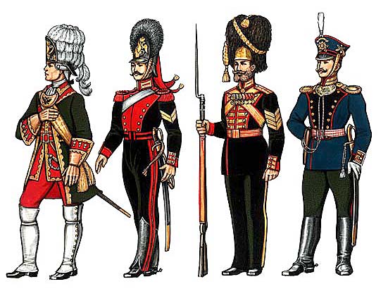 Гвардия: 1 — обер-офицер лейб-гвардии Преображенского полка. 1740; 2 — рядовой лейб-гвардии Конно-гренадерского полка 1841-48 гг.; 3 — рядовой роты Дворцовых гренадер. 2-я пол. 19 — нач. 20 вв.; 4 — обер-офицер лейб-гвардии Первой артиллерийской бригады.