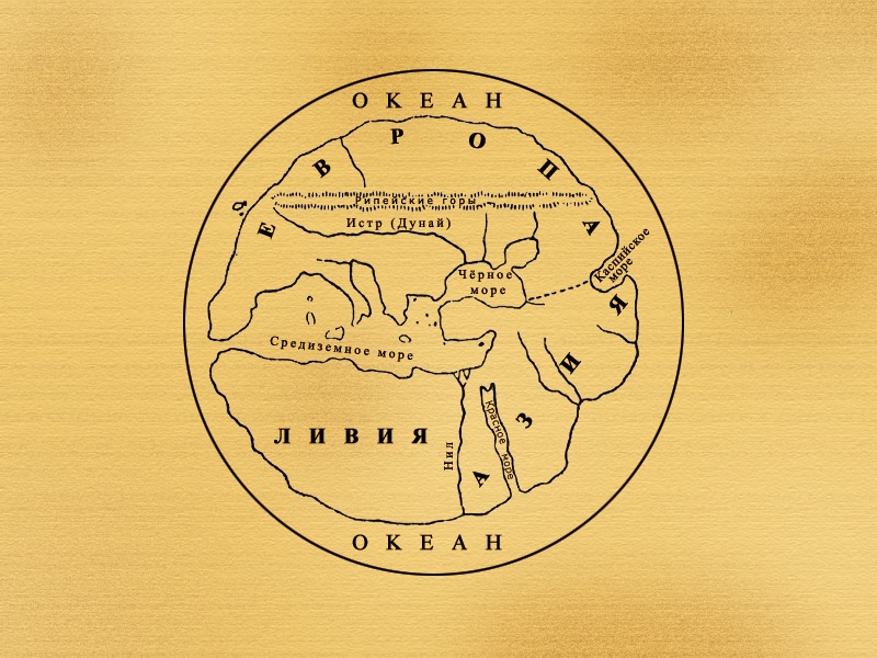 Географическая карта из книги «Объезд земли» Гекатея Милетского. На карте были впервые обозначены три части света (Европа, Азия и Ливия) и выделена область обитаемых земель — ойкумена.