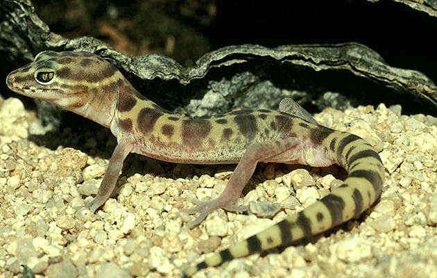 Поясной геккон (Coleonyx variegatus) - обитатель каменистых североамериканских полупустынь. Относится к роду земляных гекконов подсемейства эублефаров, объединяющего наиболее примитивных древних гекконов.