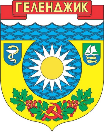 Герб Геленджика, принятый 16 февраля 1972 года. Композицию составляют: голубая бухта (символ морского порта), солнце в центре бухты, медицинская эмблема (символ курорта), парусник с рыбами. Внизу виноградная лоза (символ изобилия), серп и молот. Золотистый фон щита — симвом золотого плодородного берега. Лента с названием города напоминает об участии города в Гражданской и Великой Отечественной войнах.