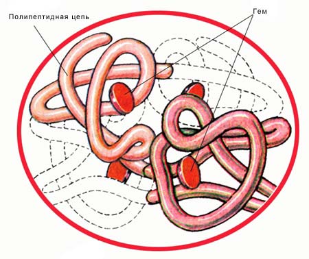 Молекула гемоглобина состоит из четырех полипептидных цепей, каждая из которых включает в себя активный центр - гем.