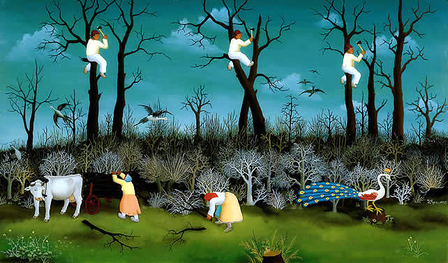 Иван Генералич. «Лесорубы». 1959. Масло, стекло. Галерея наивного искусства, Загреб, Хорватия.