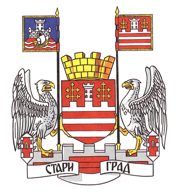 На городском гербе Старого Белграда присутствуют гербовый щит, корона, щитодержатели, знамена, постамент.
