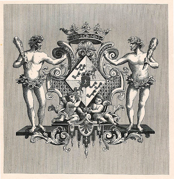 Женские гербовые щиты обычно имели форму ромба. На гравюре изображен герб герцогини Кендел.