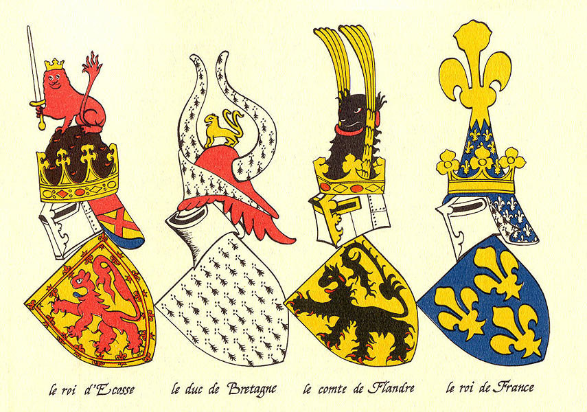 На странице из гербовника 1380 слева направо изображены гербовые щиты, шлемы и нашлемники короля Шотландии, герцога Бретонского, графа Фландрского и короля Франции.