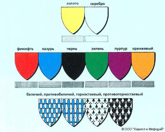 Геральдические металлы, финифти и меха. Золото (желтый) — символ богатства, справедливости, великодушия. Серебро (белый) — символ чистоты и невинности. Червлень (красный) — символ храбрости и мужества. Лазурь (голубой, синий) — символ красоты, мягкости, величия. Зелень (зеленый) — символ надежды, радости и изобилия. Пурпур (бордовый) — символ достоинства, силы и могущества. Чернь (черный, сабль) — символ печали, благоразумия, смирения.