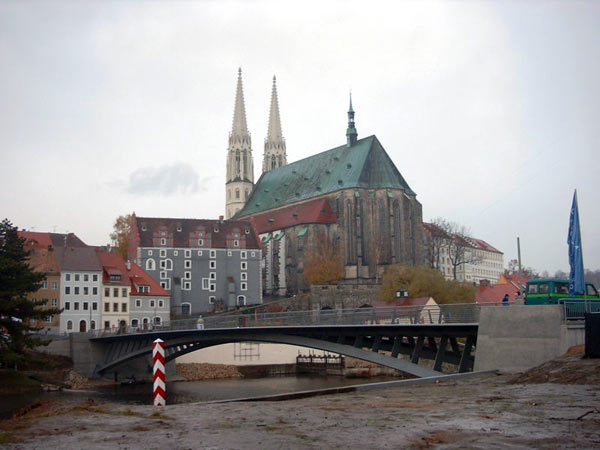 Герлиц. Пешеходный мост через реку Нейсе, связывающий исторические части города, разделенные польско-германской границей, был открыт в 2004. На мосту действует пограничный переход для пешеходов и велосипедистов. Вид с польской стороны. На заднем плане — величественная Петеркирхе.