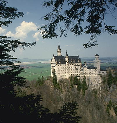 Замок Нойшванштайн в Баварии. Построен по приказу короля Людвига Баварского и должен был воплотить все представления о сказочном рыцарском прошлом Германии. Находится близ «романтической дороги» из Фюссена в Вюрцбург, но непосредственно к замку можно проехать только верхом или пешком.