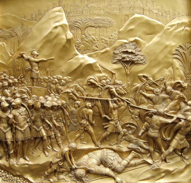 Л. Гиберти. Давид и Голиаф. Около 1435 года. Бронза, позолота. Баптистерий Сан-Джованни, Флоренция. Рельеф «Давид и Голиаф» является одной из десяти сцен, созданных Гиберти на больших бронзовых дверях баптистерия.