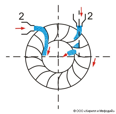 Схема активной гидравлической турбины: 1 – рабочее колесо; 2 – сопла.