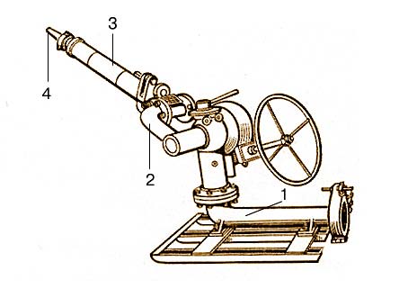 Схема гидромонитора для подземных работ с ручным управлением: 1 – неподвижное колено; 2 – подвижное колено; 3 – ствол; 4 – насадка.