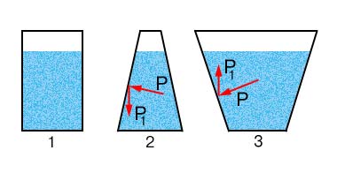 Гидростатический парадокс: в расширяющихся кверху сосудах сила давления на дно меньше веса жидкости (3), а в суживающихся — больше (2), в цилиндрическом же сосуде обе силы одинаковы (1).