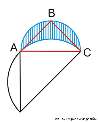 Схема построения одной из гиппократовых луночек. Площадь гиппократовой луночки (обозначена штриховкой) равна площади равнобедренного треугольника