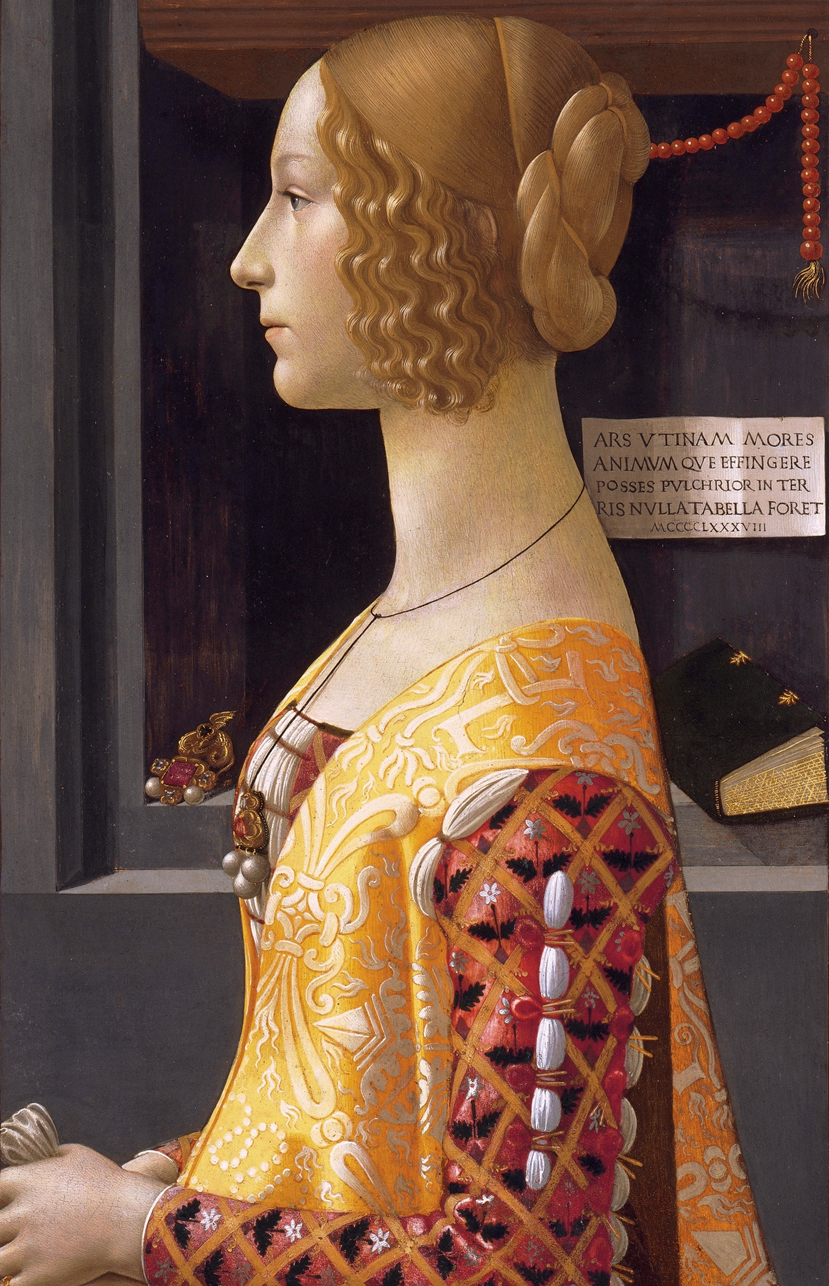 Доменико Гирландайо. Портрет Джованны Торнабуони. 1488 год. Доска, темпера. Музей Тиссена-Бернемиса, Мадрид. На заднем плане надпись с частью эпиграммы римского поэта 1 века н.э. Марка Валерия Марциала, посвященной портрету военачальника Марка Антония (Marcus Antonius Primus; около 40 — около 100): «Искусство, если бы ты могло показать характер и душу, не было бы на свете картины прекраснее». Джованна Торнабуони (1468-1488), урожденная дель Альбицци, была представительницей флорентийской аристократии и умерда при родах.