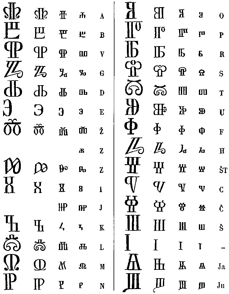 Алфавит поздней глаголицы (XX век) из книги «Abecedarivm Palaeoslovenicvm in usum glagolitarum», Ioseph Vais, 1917 год.
