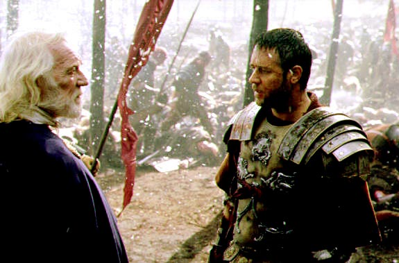 Ричард Харрис в роли Марка Аврелия, Рассел Кроу в роли Максима. Фильм «Гладиатор».